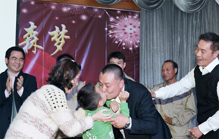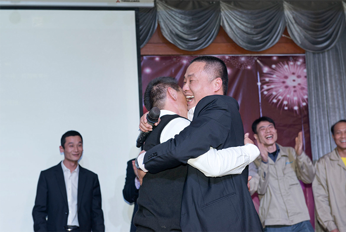 <最温馨> 作为惊喜环节, 大会特意准备了蛋糕,向全场当月生日的员工和嘉宾朋友奉上最真挚的祝福。而当天的嘉宾大寿星刘伟光先生一句“我爱你”和热烈的拥吻表达了他对家人的珍爱和对日森董事长何顺祥先生的感激之情。