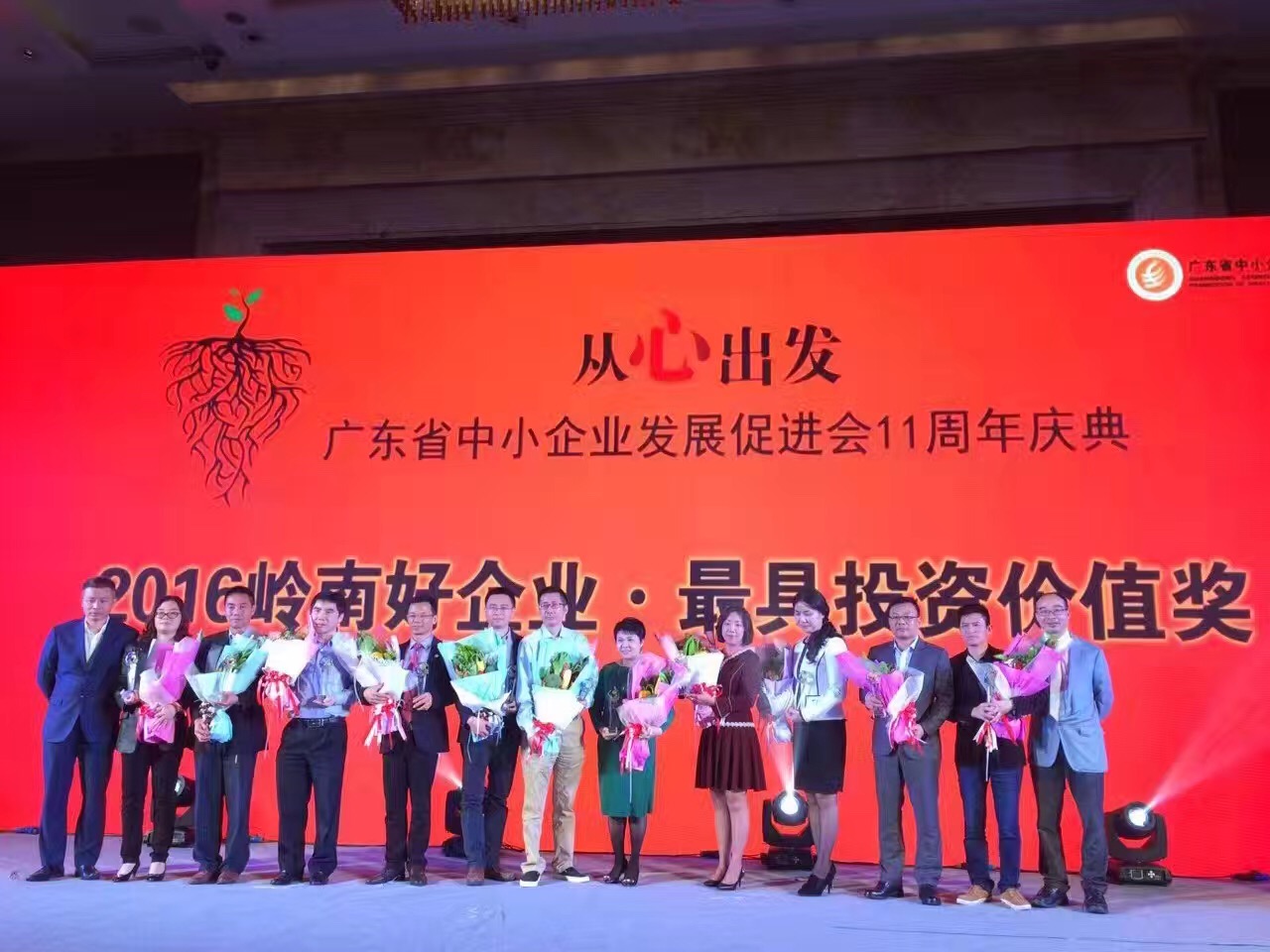 12月22日,广东省中小企业发展促进会11周年庆典暨2016岭南好企业颁奖典礼在广州圣丰索菲特大酒店隆重召开。本次大会以“2016岭南好企业”为主题,省促进会已成为华南最具有成长性和创新性的民营企业家社群,聚集超过100家国内乃至国际的行业龙头、隐形冠军,并且超过70家是上市或挂牌公司。其中日森机械凭借在创新变革、匠心制造、精益生产管理等方面突破和成绩,荣获大会“最具有投资价值奖”。